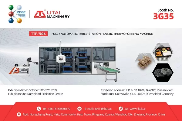 На этот раз Hangzhou Shiteng Machinery Co., Ltd. была приглашена принять участие в Международной выставке пластмасс и резины "K Times" в Дюссельдорфе, Германия. Продукция, представленная LITAI в этот раз, включает трехстанционную термоформовочную машину TTF-520A, воздушный компрессор, охладитель, воздушный резервуар.